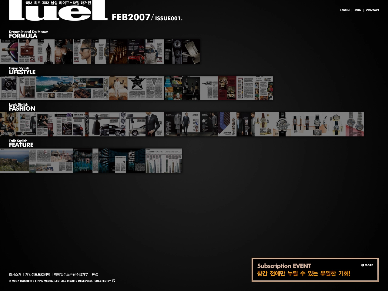 72닷컴은 남성 라이프스타일 매거진 LUEL의 창간에 맞춰, 온라인 공간에서 체험할 수 있는 온라인 매거진 LUEL을 제작했습니다. 플래시와 액션스크립트를 활용하여 온라인에서도 오프라인 처럼 고품질의 잡지를 체험할 수 있게 제작했습니다.